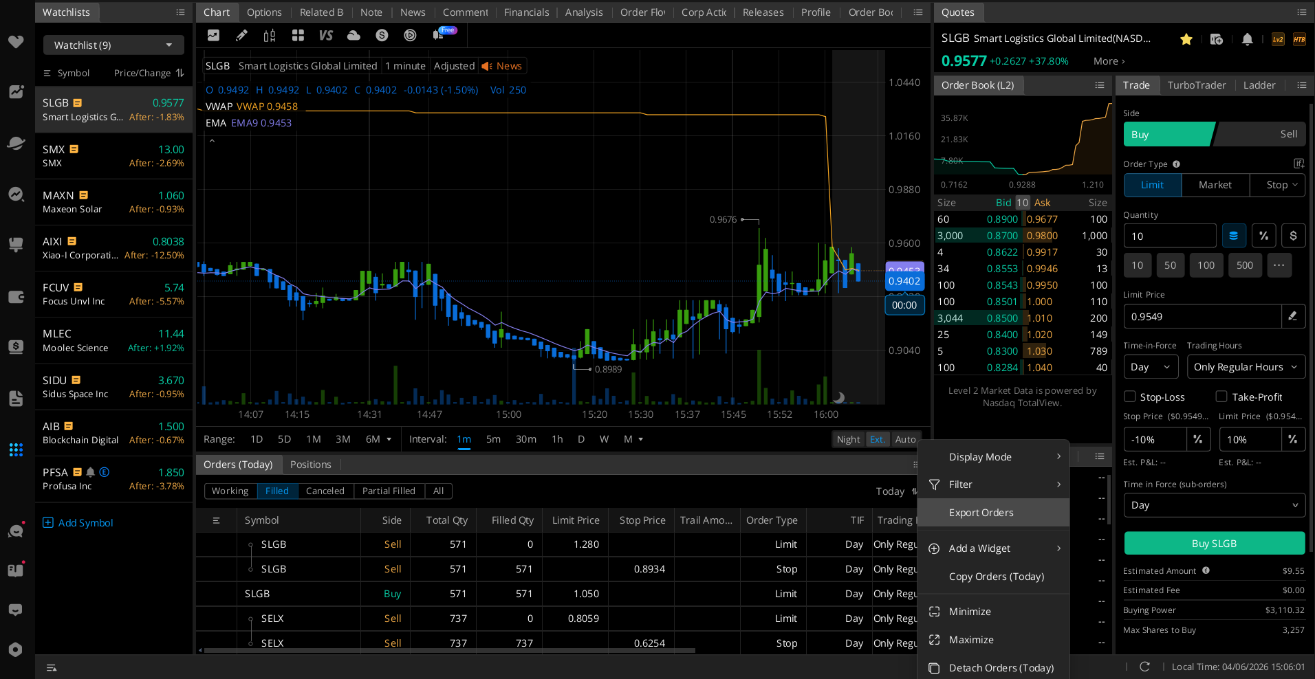 In Webull, go to your Orders panel and click the Filled tab. Click the menu icon ··· in the top right of the orders panel, then select Export Orders. Webull will download a CSV file with your complete order history.